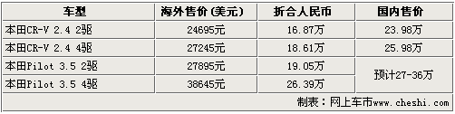 通過同屬本田旗下的SUV車型——CR-V可以看出,這款車型在美國的售價為2.46萬美元(折合人民幣約為16.87萬),而同款CR-V在國內(nèi)的售價為23.98萬元,其中間差價為7萬元左右,所以我們預(yù)計這款中級SUV的售價將在27——36萬左右。