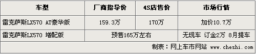 筆者目前從雷克薩斯經(jīng)銷商處了解,雷克薩斯LX570因產(chǎn)能有限,貨源供應(yīng)非常緊張。目前基本是訂單式銷售,而提現(xiàn)車的話加價金額則超過了10萬元。同時,雷克薩斯LX570增配版車型將于8月份到店,銷售人員介紹,增配版車型將增加智能副駕系統(tǒng),同時在內(nèi)飾和外觀上也有小幅的變化,預(yù)計售價在165萬左右。具體售價目前尚未公布,現(xiàn)在消費(fèi)者訂車需要2萬元定金,一個月左右方可提車。