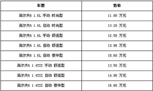 一汽大眾第六代高爾夫大眾第六代高爾夫19日在長春一汽大眾二廠總裝車間內(nèi)上市。此次上市的車型包括三款1.6L車型、二款1.4T車型,售價區(qū)間為:11.88-16.68萬元。具體價格表如下: