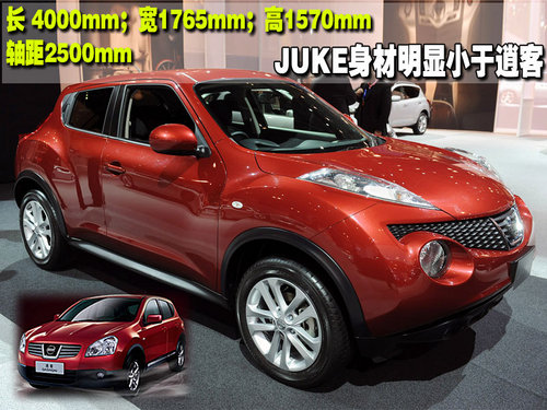 日產JUKE車身尺寸為:長4000mm;寬1765mm;高1570mm,從車身尺寸上看,全新的Juke的明顯小于日產逍客Qashqai,完全符合其入門級的定位。JUKE的軸距為2500mm,比逍客短了130mm,意味著它的內部空間將相對比較緊湊。