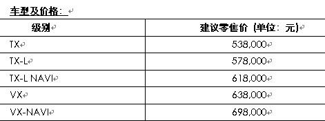 作為舊款VX級(jí)別車型的延續(xù),TX-L級(jí)別配置更加豐富,采用4.0L雙VVT-i的發(fā)動(dòng)機(jī),性能大幅提升。除沿用了舊款VX級(jí)別所配備的主動(dòng)牽引力控制系統(tǒng)A-TRC以及車輛穩(wěn)定控制系統(tǒng)VSC外,還增加了第三排座椅電動(dòng)折疊功能、智能鑰匙及一鍵啟動(dòng)系統(tǒng)、自發(fā)光式儀表盤等,同時(shí),SRS空氣囊也增至7個(gè)。在這種配置下,TX-L級(jí)別的價(jià)格設(shè)定為57.8萬(wàn)元,比舊款VX級(jí)別的價(jià)格還低7千元。