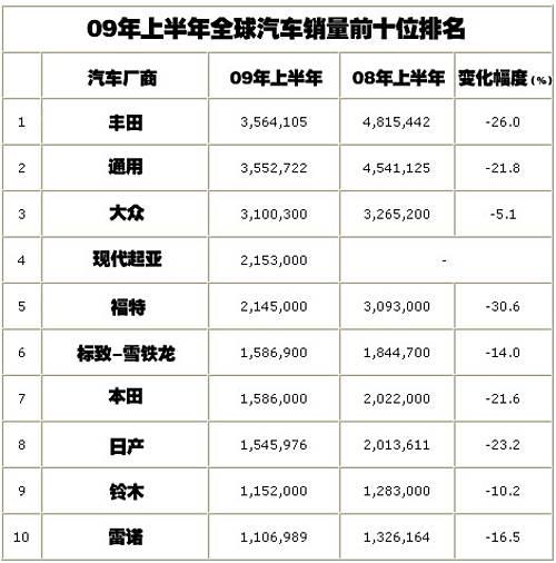 2009年已經(jīng)過(guò)半,各大汽車廠商也將會(huì)對(duì)自己上半年的汽車銷售銷量做一下統(tǒng)計(jì)。受全球經(jīng)濟(jì)危機(jī)的影響,各汽車廠商的銷售也分別受到了不同程度的影響。而以下則是來(lái)自汽車新聞數(shù)據(jù)中心的數(shù)據(jù), 下面就讓我們來(lái)看看排在前十位的汽車品牌在上半年的銷售情況如何。