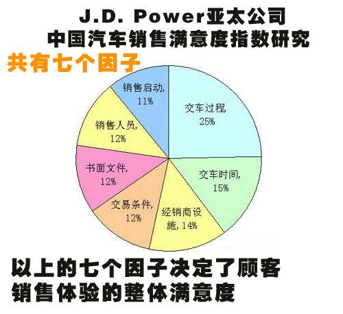 J.D. Power亞太公司在中國開展的汽車銷售滿意度指數(shù)研究共有七個因子決定了顧客銷售體驗(yàn)的整體滿意度;根據(jù)重要性排列,分別是:交車過程、交車時間、經(jīng)銷商設(shè)施、銷售人員、書面文件、交易條件和銷售啟動。
