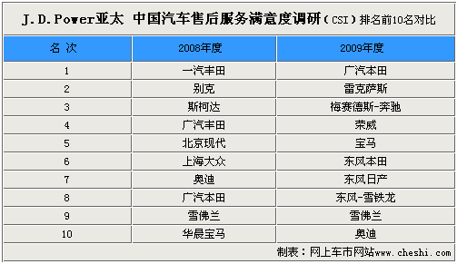 通過以上08年度與09年度的J.D. Power(亞太公司)中國汽車銷售滿意度前10名的對比我們不難看出,合資品牌還是占據(jù)了主要的位置,但日系廠商的排名有所下降。08年度的第一名奧迪意外的被自主品牌榮威所代替,寶馬提升至第4名,梅賽德斯-奔馳落后2名。而中華則闖入前10名,替代了斯柯達(dá)的位置。
