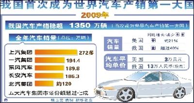 中國(guó)汽車技術(shù)研究中心首席專家黃永和10日對(duì)記者說(shuō),2009年中國(guó)汽車產(chǎn)銷超過(guò)1350萬(wàn)輛,首次成為世界汽車產(chǎn)銷第一大國(guó)。他預(yù)計(jì)2010年中國(guó)汽車產(chǎn)銷會(huì)超過(guò)1500萬(wàn)輛,跨國(guó)汽車公司將從中繼續(xù)受益。據(jù)新華社電
