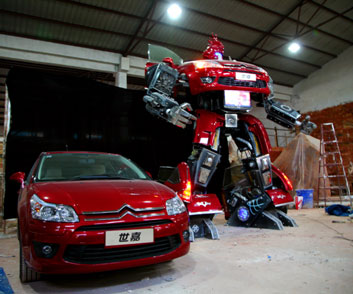 中新網(wǎng)4月15日電 2009上海國際車展即將開幕,除了輪番轟炸的多款新車和概念車外,又有重磅消息傳來。據(jù)悉,此前曾攜東風(fēng)雪鐵龍C2機(jī)器人“大鬧”廣州車展的南京車迷,這次又有大動作。一個(gè)高達(dá)4.5米、寬4米、厚3米、整體重量近2噸,帶聲、光、電系統(tǒng),以東風(fēng)雪鐵龍世嘉車為原形、結(jié)合中國傳統(tǒng)龍文化的巨型汽車人已經(jīng)在南京誕生,而且極有可能于上海車展現(xiàn)身。