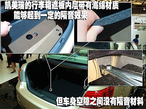 我們看到凱美瑞的行李箱與備胎之間的蓋板上設(shè)計了非常厚的一層隔音材料,這部分設(shè)計能夠較好的實現(xiàn)阻隔行駛中噪音的作用。但是在行李箱內(nèi)部覆蓋件與車身之間我們同樣沒有看到任何隔音材料的填充。