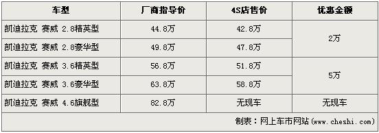據(jù)4S店銷售人員介紹,目前凱迪拉克SLS賽威全系最高優(yōu)惠5萬元。2.8L分為精英版和豪華版兩個(gè)車型,經(jīng)2萬元優(yōu)惠后售價(jià)分別降到了42.8萬元和47.8萬元。3.6L車型優(yōu)惠5萬元達(dá)到了全系的最高,優(yōu)惠后3.6精英版售價(jià)從56.8萬元下降到了51.8萬元,3.6豪華版售價(jià)也從63.8萬元下降到了58.8萬元。