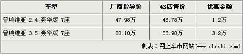 對(duì)中國(guó)的消費(fèi)者來說,豐田普瑞維亞是一款耳熟能詳?shù)能囆,通常人們都成為大霸王。這款車在空間、舒適度和配置等方面在同級(jí)別車型中擁有比較明顯的優(yōu)勢(shì),但價(jià)格卻一直居高不下。根據(jù)網(wǎng)上車市價(jià)格監(jiān)測(cè)系統(tǒng)顯示,目前普瑞維亞出現(xiàn)了最高3.2萬(wàn)元的優(yōu)惠,具體車型已經(jīng)價(jià)格如下: