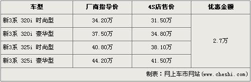新寶馬3系在去年12月份正式在國內市場正式上市銷售,經過改款后的3系從外觀的流線,到內飾的風格均有一定程度的變化,帶給消費者的是全新的視覺沖擊和駕馭樂趣。根據(jù)網(wǎng)上車市價格監(jiān)測系統(tǒng)顯示,新寶馬3系車型全系出現(xiàn)了2.7萬元的現(xiàn)金優(yōu)惠,具體車型價格如下:
