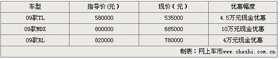 據(jù)謳歌經(jīng)銷商表示,購買謳歌全系除了可以得到最高10萬元的價(jià)格優(yōu)惠外,09款TL僅售53.5萬元。銷售人員還表示,現(xiàn)在謳歌系列車型顏色和車型齊全,可以給客人與最大的選擇空間!