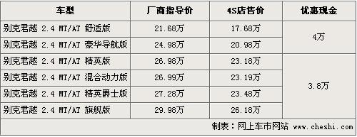 別克君越一直是中高級車市最受關注的車型之一,這款車搭載了全球普及率較高的ECOD-VVT2.4L全鋁智能發(fā)動機,并配以6速手自一體變速箱,在動力上比老款有非常大的提升。根據(jù)網(wǎng)上車市價格監(jiān)測系統(tǒng)顯示,目前君越優(yōu)惠已過4萬元,具體車型和價格如下: