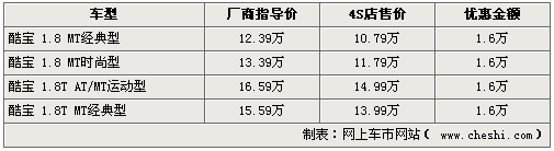 酷寶系列車型,不僅外形時(shí)尚,動(dòng)力也相當(dāng)充沛,不僅可與進(jìn)口跑車如蓮花競速相媲美,也帶動(dòng)了自主跑車市場的競爭。近期網(wǎng)上車市網(wǎng)站了解到,隨著市場競爭的加劇,現(xiàn)在各家4S店均可給出全系16000元的現(xiàn)金優(yōu)惠,令此車型再次引起關(guān)注。具體詳情如下: