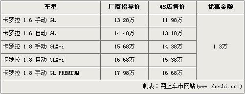 卡羅拉是一汽豐田07年推出的主力經(jīng)濟(jì)型轎車,此車全系共有5款車型,排量分為1.6L、1.8L,價(jià)格區(qū)間為13.28萬(wàn)元-17.98萬(wàn)元。近日根據(jù)網(wǎng)上車市價(jià)格監(jiān)測(cè)系統(tǒng)顯示,卡羅拉全系優(yōu)惠1.3萬(wàn)元,最低售價(jià)不足12萬(wàn)元,具體詳情請(qǐng)看下表: