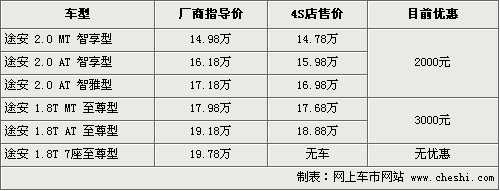 2月份,上海大眾進(jìn)行了09年首次價(jià)格調(diào)整,新途安的價(jià)格下調(diào)了3100元-3500元,售價(jià)為14.98萬(wàn)-19.78萬(wàn)。根據(jù)網(wǎng)上車(chē)市價(jià)格監(jiān)測(cè)系統(tǒng)顯示,在官方調(diào)整價(jià)格基礎(chǔ)后,近期4S店還有2000元-3000元的降幅,具體行情如下: