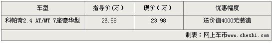 雪佛蘭Captiva科帕奇不僅豐富了雪佛蘭產(chǎn)品陣容,深化了雪佛蘭年輕活力、值得信賴的國(guó)際化品牌內(nèi)涵,更填補(bǔ)了上海通用汽車在中檔SUV細(xì)分市場(chǎng)上的空白。近日根據(jù)網(wǎng)上車市價(jià)格監(jiān)測(cè)系統(tǒng)顯示,上海地區(qū)購(gòu)買雪佛蘭科帕奇2.4 AT/MT 7座豪華型 可以得到2.6萬元的價(jià)格優(yōu)惠。具體車型報(bào)價(jià)如下表: