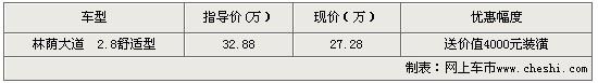 據(jù)林蔭大道銷售人員表示,購(gòu)買林蔭大道 2.8舒適型除了可以得到最高5.6萬(wàn)元的價(jià)格優(yōu)惠外,商家還在每輛車銷售的同時(shí)還搭配汽車裝潢贈(zèng)品。商家現(xiàn)在展廳有黑色和炭晶兩款現(xiàn)車。更多詳情隨時(shí)聯(lián)系經(jīng)銷商。
