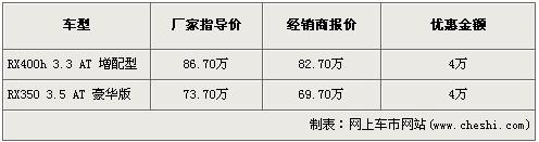 根據(jù)網(wǎng)上車市價(jià)格監(jiān)測系統(tǒng)顯示,目前在80萬級別的進(jìn)口SUV中,寶馬X5,奧同Q7的優(yōu)惠都 在4萬元的幅度,可見4萬元的優(yōu)惠是一個(gè)比較常見的讓利。而雷克薩斯RX350自上市以來的優(yōu)惠最高大約去到6萬元左右,在新款上市后,舊款RX350的剩車已經(jīng)不多。