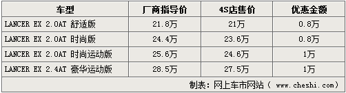 以純進口車身份銷售的三菱LANCER EX上市后,憑借上佳的質(zhì)量及性能受到消費者喜愛。據(jù)網(wǎng)上車市網(wǎng)站得到的消息,近期北京各家進口三菱經(jīng)銷商處已經(jīng)出現(xiàn)了價格松動,除低配車型優(yōu)惠仍為8000元外,2.0L高配車型以及頂配的2.4L豪華運動版車型均可給出10000元優(yōu)惠。詳情如下: