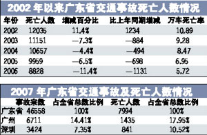 2007年,廣東省與廣州市地區(qū)均實現(xiàn)道路交通事故四項指數(shù)下降的目標(biāo)和特大交通事故大幅下降的目標(biāo),創(chuàng)造了道路交通事故死亡人數(shù)連續(xù)“五年連降”的成績,2007年更是首次沒有發(fā)生一次死亡10人以上的惡性交通事故。
