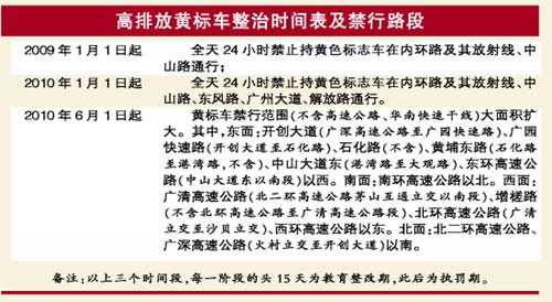 按照整治時(shí)間表,廣州市估計(jì)將有26萬(wàn)輛黃標(biāo)——高排放或高污染汽車(chē),從2009年1月1日起,全天24小時(shí)禁止在內(nèi)環(huán)路及其放射線、中山路通行。