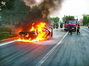 油箱存爆炸危險(xiǎn) 消防隊(duì)員冒險(xiǎn)撲救自燃尼桑轎車(chē)