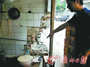 昨日上午,記者在順德區(qū)供電局附近看到,紅廟一街十五巷右邊的譚氏民居與一家水果店相接的墻角,被撞出一個能鉆進(jìn)一個大人的洞口,水果店的一扇2米長的墻體完全開裂,譚氏民居內(nèi)的馬桶被撞后成了碎片,門邊的一堵墻體也撞倒了,屋里到處是磚頭。此時,巷子左邊一家磨具店的老板得知店外出事后,卻怎么也打不開卷閘門,最后通過“武力”撬開門后才發(fā)現(xiàn)大門外部已被撞癟。