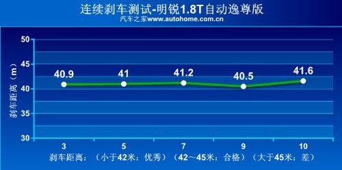 輪胎雖然抓地力略顯不足,但總體來說是提高了加速成績。但剎車測試中明銳就明顯不及速騰冠軍版了。明銳裝備了前通風盤后盤式的剎車系統(tǒng),這套系統(tǒng)在剎車測試中表現(xiàn)出極佳的穩(wěn)定性,多次剎車成績都保持在41米左右,幾乎沒有熱衰的表現(xiàn)。此外明銳的懸掛也很硬朗,剎車姿態(tài)保持的很好,這也給駕駛者很大的信心。最終41.2米的成績雖然放在本文中并不是最好的,但縱觀同級別對手還是相當不錯的表現(xiàn)。