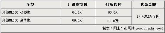 記者目前北京地區(qū)奔馳經(jīng)銷店了解到,現(xiàn)在購(gòu)買(mǎi)奔馳ML350動(dòng)感版和豪華型的消費(fèi)者都可享受現(xiàn)金1萬(wàn)元的優(yōu)惠,并且購(gòu)車的消費(fèi)者還可獲得4S店贈(zèng)送的全車的保險(xiǎn),價(jià)值2萬(wàn)元左右。銷售人員還介紹,目前4S店內(nèi)沒(méi)有奔馳ML現(xiàn)車供應(yīng),欲購(gòu)買(mǎi)車需等待一個(gè)月左右方可提車。