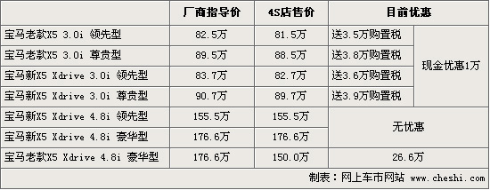 筆者從寶馬北京地區(qū)經(jīng)銷商處了解到,近日寶馬重磅推出了“四重購(gòu)車禮的”新春購(gòu)車促銷活動(dòng),其中有一項(xiàng)是送車輛購(gòu)置稅,針對(duì)車型包括X5在內(nèi)。據(jù)介紹,從2月1日到3月31日期間購(gòu)買(mǎi)X5的客戶可以贈(zèng)送50%的車輛購(gòu)置稅,其中包括了新老款共四款車型,但只針對(duì)3.0排量。新X5尊貴型3.0排量最高送近4萬(wàn)元的購(gòu)置稅,購(gòu)車同時(shí)3.0排量還將有1萬(wàn)元左右的現(xiàn)金優(yōu)惠。而目前老款X5豪華型1.8排量還有少量現(xiàn)車,當(dāng)前最高優(yōu)惠可達(dá)到26.6萬(wàn)元。4S店內(nèi)有黑色和銀色的現(xiàn)車供應(yīng),消費(fèi)者可到店咨詢具體行情。