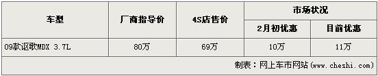 據(jù)謳歌經(jīng)銷商銷售人員介紹,謳歌08款MDX已經(jīng)停止進口現(xiàn)車已賣完,以后也不會再引進。目前在售的為謳歌09款MDX車型,09款謳歌-MDX的優(yōu)惠現(xiàn)已加大到11萬元,優(yōu)惠后售價也從原廠商售價80萬降到了69萬,跌破了70萬元。銷售人員還介紹,09款謳歌MDX增加的實用性的配件包括前下護板和后下護板,能避免惡劣路況對底盤帶來的損傷,并且09款謳歌MDX還新增了巴厘海藍和摩卡褐金兩種顏色,店內(nèi)現(xiàn)車非常充足,顏色也比較全,欲購買者挑選的空間非常大。
