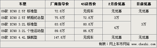 據(jù)沃爾沃4S店銷售人員介紹,目前銷售的沃爾沃XC90均是09款新車,其中2.5T帆船紀念版車型和3.2兩個排量車型可優(yōu)惠現(xiàn)金3萬元,其他2.5T標準版和4.4旗艦版沒有優(yōu)惠,F(xiàn)車方面,4S店有藍色款現(xiàn)車供應,個別款顏色需要消費者先行預定。