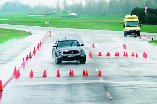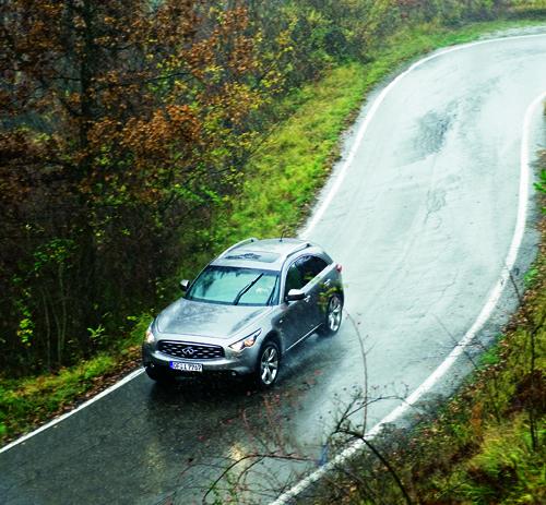 高速公路更適合FX37S的發(fā)揮,車子的隔音性很好,不過CDC主動(dòng)式懸架似乎在模仿跑車效果。FX37S在瀝青路的抓地作用很強(qiáng),給21英寸輪轂有力的支持,而且?guī)缀鯖]有車身晃動(dòng)。另外,及時(shí)有力的轉(zhuǎn)向可與轎跑車媲美,為車子的操控性作出了很多貢獻(xiàn)?傊,在公路上,英菲尼迪FX37S快速、安全、有樂趣,但如果要在雪地駕駛,我們建議小號(hào)輪轂和冬季輪胎。通常情況下,F(xiàn)X37S采用后輪驅(qū)動(dòng),一旦輪胎打滑,扭矩將通過中央離合器給前輪分配扭矩,前輪最大比例可獲得50%的輸出扭矩。