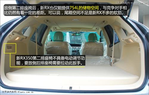 即使放倒了第二排座椅,新RX也只能提供754L的儲物空間,與一種德、美系車型動(dòng)輒超過1500L的后排儲物空間相比,仍然有著一定的差距?梢哉f,偏小的儲物空間是新RX350上不多的軟肋。