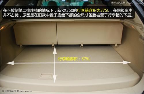在不放倒第二排座椅的情況下,新RX350的行李箱容積為375L,在同級車中并不占優(yōu),原因是在舊款中置于地盤下部的全尺寸備胎被置于行李箱的下層。這樣設(shè)計(jì)的優(yōu)點(diǎn)就是讓司乘人員可以在車輛需要更換輪胎的時(shí)候,不至于要趴在徹底拆卸備胎。目前,越來越多的城市SUV采用這樣的設(shè)計(jì)。