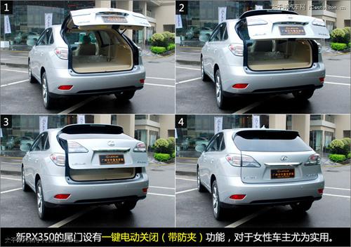 新RX350的尾門設(shè)有一鍵電動(dòng)關(guān)閉(帶防夾)功能,對于身材嬌小的女性車主來說尤為實(shí)用。值得一提的是,這個(gè)價(jià)位的SUV中,配有該項(xiàng)功能的車型并不算多,像奔馳ML350等就沒有安裝該系統(tǒng)。