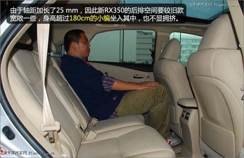 前文已經(jīng)提過,新RX350的車身長度要較舊款長30 mm,軸距也較舊款長25mm,因此新RX350的后排空間要較舊款寬敞一些,身高超過180 cm的小編坐入其中,也不顯擁擠。不過由于車身高度較舊款車型有所降低,RX350后排的頭部空間與舊款相比沒有什么優(yōu)勢可言。