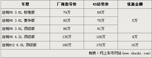 據(jù)經(jīng)銷商銷售人員介紹,目前店內(nèi)途銳全系均有不同優(yōu)惠,最高讓利達到了10萬元。搭載V6發(fā)動機的3.6L車型優(yōu)惠現(xiàn)金5萬元,3.6L車型經(jīng)優(yōu)惠后售價分別為:標準型69萬元,豪華型75萬元,頂級型81萬元;搭載V8發(fā)動機的3.6L頂級型經(jīng)9萬元優(yōu)惠后售價降到了126萬元;搭載W12發(fā)動機的全系頂配車型6.0L頂級版經(jīng)10萬元的優(yōu)惠后售價從180萬降到了170萬元。