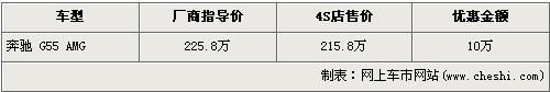 根據(jù)北京奔馳4S店銷售人員介紹,目前奔馳G55 AMG現(xiàn)金優(yōu)惠10萬元。經(jīng)優(yōu)惠后,奔馳G55 AMG售價從廠商指導(dǎo)價的225.8萬元下降到了215.8萬元。銷售人員還介紹,奔馳G55 AMG只有一部黑色現(xiàn)車在售,而且北京多家奔馳經(jīng)銷店均無現(xiàn)車,消費者挑選的空間不大。顏色方面引進國內(nèi)的G55 AMG只有黑色,其他顏色均不銷售。