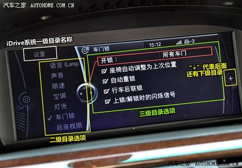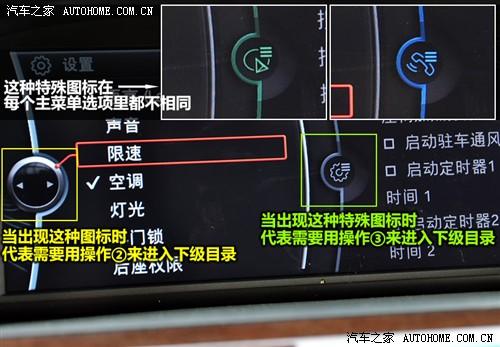 當(dāng)我們進(jìn)入“設(shè)置”選項(xiàng)的二級(jí)目錄時(shí),在二級(jí)目錄的左右兩邊我們可以看到兩種不同的圖標(biāo)。左邊的圓形帶有兩個(gè)小箭頭的圖標(biāo)表示如果想進(jìn)入左側(cè)的上級(jí)目錄需要使用②撥動(dòng)方式向左撥動(dòng)旋鈕進(jìn)入,而右邊的特殊圖標(biāo)表示如果想進(jìn)入右側(cè)的下級(jí)目錄需要使用③向下按的方式進(jìn)入?偟膩(lái)說(shuō),這種左右分列的目錄形式比老款要更符合人們的日常習(xí)慣,因此比老款iDrive系統(tǒng)更容易得到用戶(hù)的認(rèn)可。