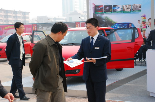 中新網4月19日電在2009(第六屆)全國百強縣市汽車巡展壽光站的現場筆者發(fā)現了這樣的一幕,與其他廠商不同,上海大眾斯柯達的經銷商濰坊天和汽車銷售服務有限公司的銷售人員,不但在展位為前來咨詢的消費者進行講解,而且還走出展位,走到展位外面為消費者講解,吸引消費者來了解更多車輛信息。