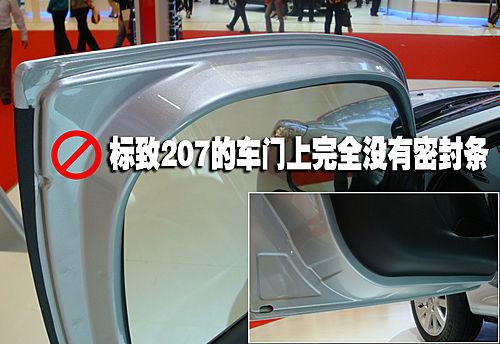 標(biāo)致207在車門一側(cè)完全沒有設(shè)計(jì)密封條,在其車門上也沒有任何可以固定密封條的固定點(diǎn)。不過在車身一側(cè)門框的位置設(shè)計(jì)了兩道密封,不過盡管是這樣標(biāo)致207依然是這項(xiàng)對比中最差的一個。