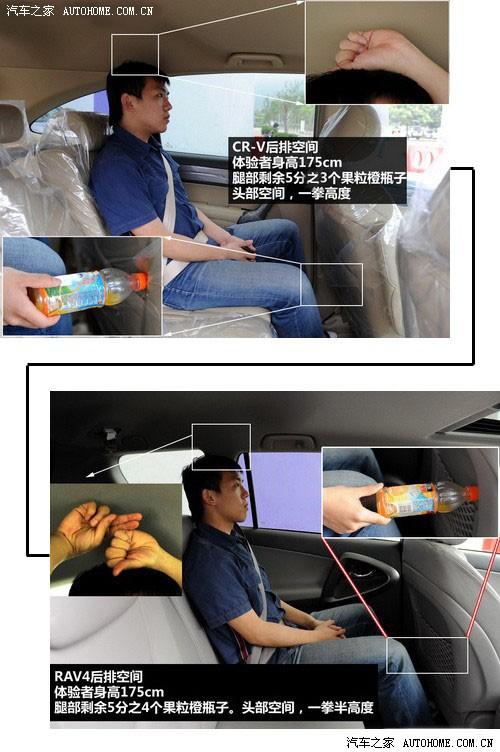 后排空間方面,之前我們看到了RAV4軸距比CR-V長(zhǎng)了4厘米,實(shí)際體驗(yàn)中,這4cm在坐進(jìn)人之后的空間差距還真不小,大家仔細(xì)看圖,RAV4剩余了5分之4個(gè)瓶子長(zhǎng)度空間,而CR-V只剩下5分之3個(gè)瓶長(zhǎng),基本上后排腿部CR-V比RAV4短了3-5厘米的距離。(前排位置都是同一人調(diào)整好的)。