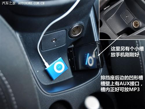 排擋座的后面是一個凹槽,槽壁上是AUX接口和電源。如果接MP3就剛好可以把播放器放在這個槽內,很方便。另外,右邊還有一個更深的槽,恰好是一個手機的寬度,放進去一試果然非常合適;蛘甙袽P3放在深槽里,淺槽內還能放些零錢票據之類的也不錯。