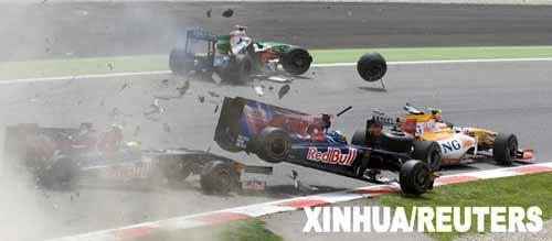 5月10日,紅牛二隊(duì)車手布爾代(前中)和隊(duì)友布埃米(前左)以及印度力量車隊(duì)車手蘇蒂爾(后)、雷諾車隊(duì)車手皮蓋駕駛的賽車發(fā)生碰撞。當(dāng)日,F(xiàn)1西班牙大獎(jiǎng)賽落幕,布朗GP車隊(duì)的英國車手巴頓奪得冠軍。新華社/路透