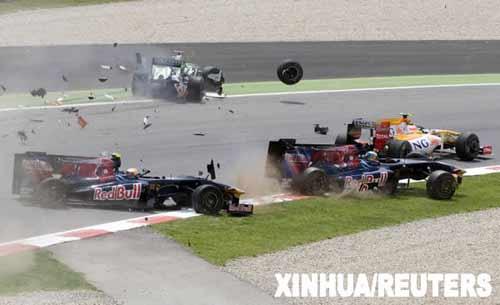 5月10日,紅牛二隊(duì)車手布爾代(前中)和隊(duì)友布埃米(前左)以及印度力量車隊(duì)車手蘇蒂爾(后)、雷諾車隊(duì)車手皮蓋駕駛的賽車發(fā)生碰撞。當(dāng)日,F(xiàn)1西班牙大獎(jiǎng)賽落幕,布朗GP車隊(duì)的英國車手巴頓奪得冠軍。新華社/路透