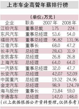 4月底所有上市車企披露了2008年年報(bào),高管薪酬也浮出了水面。2008年并不算是個(gè)好的年份,上半年市場(chǎng)尚好但遭遇了成本高漲的壓力,下半年市場(chǎng)急劇降溫,企業(yè)利潤(rùn)也快速下滑。但上市公司高管的薪酬基本上還是穩(wěn)中有升,當(dāng)然,與2007年同比2006年的大幅增長(zhǎng)不可同日而語(yǔ)。商用車企業(yè)的薪酬要遠(yuǎn)高于乘用車車企高層,高管薪酬超過(guò)100萬(wàn)元的全是商用車企業(yè)。