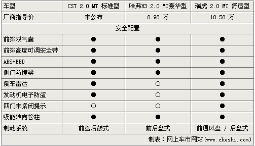 在安全配置,三款車都標配前排雙氣囊、ABS+EBD、側(cè)門防撞梁等安全裝備,但瑞虎的配置無疑是最全的,但售價要比哈弗H3貴近1.6萬元,而獵豹cs7的售價還未公布。倒車雷達、電子防盜等都為CS7標配,但前盤后鼓的剎車設(shè)計讓人有些失望。