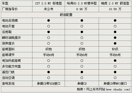 在舒適配置上,三款車的配置基本相當,都配有電動后視鏡、手動6向調(diào)節(jié)的針布座椅、普通空調(diào)、單碟CD音響,不過售價比較高的瑞虎還有比較人性化的瞬時油耗提示、保養(yǎng)提示,三款車都配置了遙控門鎖,方便駕駛者操作車輛。