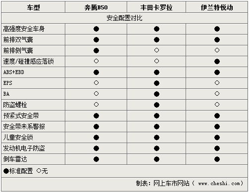 在安全裝備上,奔騰B50五款車型采用的是同樣的配置,前排雙氣囊、駕駛員自動(dòng)預(yù)緊安全帶、駕駛員安全帶未系報(bào)警等都為標(biāo)配,防炫目?jī)?nèi)后視鏡、后門兒童鎖、間歇式寬幅雨刷都為保障駕駛安全設(shè)計(jì)。對(duì)比另外兩款車型則少了EPS以及BA等輔助安全系統(tǒng)。